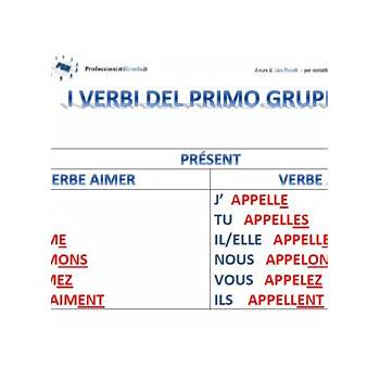 La coniugazione dei verbi in francese i verbi francesi, salvo le dovute eccezioni, possono essere divisi in quattro gruppi • 1 gruppo:In questa sezione troverete schede, verifiche ed esercizi o schede da stampare per la materia francese, livello scuola secondaria inferiore, esercizi sui verbi. MappeDSA un aiuto alla dislessia LA TERZA DECLINAZIONE (2° GRUPPO) Per coniugare un verbo dobbiamo prima conoscere la sua radice. Potrete vedere anche una lista dei verbi più. La grammatica del verbo francese.. Il primo, quello dei verbi in 'er' (tra cui aimer e appeler coniugati nella.