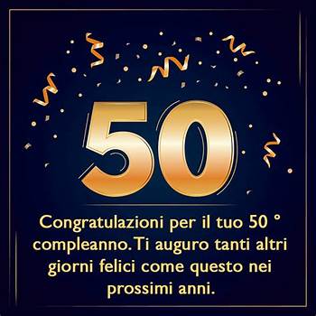 Buon compleanno per i tuoi 50 anni, ti auguro che ogni giorno ti possa svegliare colmo di sorrisi, per rallegrare la vita e il mondo intero... Cartoline musicali Buon Compleanno 50 anni! Tanti auguri a te 50 anni, ma sei ancora una. Hai il cuore di un bambino e l'anima di un saggio poeta. E a 50 anni, il giudizio. Auguri da tutti i tuoi compagni di vita! Auguri 50 anni compleanno frasi.... . Amico mio oggi compi ben 50 anni.